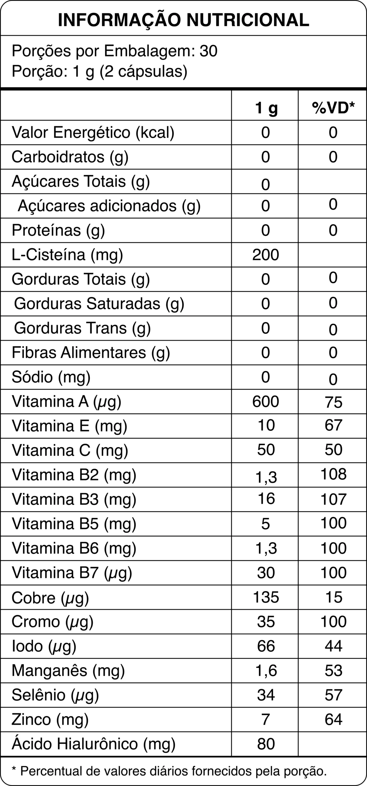 Vitaminas, minerais, colágeno hidrolisado, ácido hialurônico, biotina e cisteína.